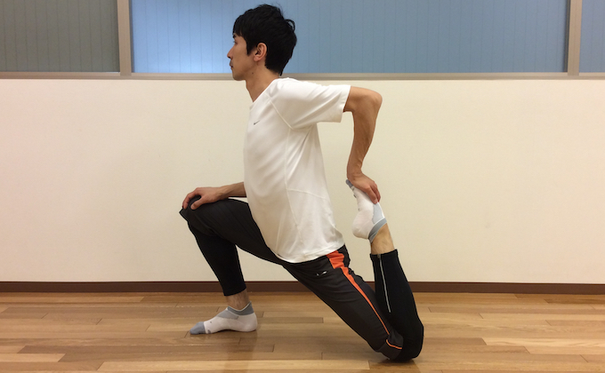 片膝立ちから骨盤を前に移動した姿勢から後ろ脚のつま先をつかみ膝を曲げます。後ろ脚のもも前〜ソケイ部の筋肉が伸びているところで15〜30秒キープします。